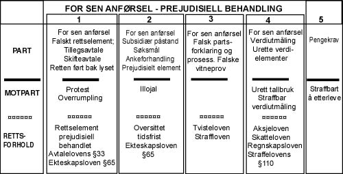 Lagdommer Ranveig Sjøvoll Som følge av å la seg bli ført bak lyset, anvender disse dommere en straffbar handling. Motpart til den kriminelle stemples som illojal. Dommerne anvender likhetstegn mellom akjseselskapsverdier og private verdier. Disse verdier deler så dommerne ut til den kriminelle part, som om midlene var tilført motpart. Den juridiske metode er basert på følgende juridisk kriminelle strategi:1.Få en rettavgjørelse som har en prejudisiell premiss til grunn for sin slutning/avgjørelse.2. Anvende en for sen anførsel i den muntlige ankeforhandling, der den for sene anførsels tema, på enhver måte er holdt skjult.Metoden er velegnet ved ekteskapslovens §65, privat inngått skifteavtale, hjemlet i rettsregelens tidsfrist, tre års tidsfrist. Ytterligere er rettsregelen gunstig, ved at denne tidsfrist kan oversittes dersom sak er reist innen tre år, med grunnlag i en annen skifteavtale. 3.I den juridiske kriminelle handling ved den for sen anførselen, anvender et sett av saksforhold, slik illutstrasjonen nedenfor viser.Motpart blir helt overkjørt i mengden av usannheter, og motpart blir totalt forsvarsløs. 4.Forberedelse til denne kriminelle handling gjøres i tingretten. Der kan leveres dokumenter direkte til dommer.Disse dokumenter anvender så den kriminelle i en for sen anførsel, som kilde for den omtalte mengde av usannheter. ¤¤¤¤¤¤¤¤¤¤¤¤¤¤Den juridiske kriminelle metode kan oppnå fullt gjennomslag ved et dommerpanel i lagmannsretten. Et panel som blir ført bak lyset eller kanskje lar seg føre bak lyset. Motpart vil ha store vanskeligheter med å få rettet opp den juridiske kriminelle handling, for ved dette er domstolen selv involvert i urett. Rettsmetode om pengekrav og pengekravets betydning for rettskraft blir en rettsmetodikk. Domstolen anvender den prejudisielle premiss bundet til en fullbyrdelsesforpliktelse ved en underskrift, ved ny behandling, bundet til en for sen anførsel, som blir gitt rettskraft som følge av den for sene anførselen, fordi den kriminelle er tilkjent et pengebeløp. "Belønningen" for å la domstolen føre seg bak lyset, binder domstolens svik! Dette er juridisk kriminalitet satt i system. Vår rettsordning har vist seg å være skandaløs, ved å tillate juridisk kriminalitet å florere i domstolen. Rettsikkerhet er totalt fraværende. Vedlagte illustrasjon viser hvordan en for sen anførsel er gitt behandling. Behandlingen etter den for sene anførselen er i sin helhet prejudisiell. Den part som har anvendt en slik for sen anførsel, må bære det hele og fulle ansvar for sin urett. Rettstema knyttet til en for sen anførsel, der en prejudisiell premiss tas til behandling, er i seg selv åpenbart fortsatt prejudisiell. Av den grunn skal ikke den kriminelle handling gi økonomisk gevinst, og demed gjøre den kriminelle handling rettskraftig. Å tillate slikt blir som å si at "bruken av tyvgodset legaliserer tyveriet". Se illustrasjonen hvordan dette har funnet sted. Punkt 1 til 4 i illustrasjonen, er som følge av en for sen anførsel. Punkt 5 skal selvsagt ikkedekke over rettskriminaliteten, selv om domstolen er medansvarlig. Tvert om.